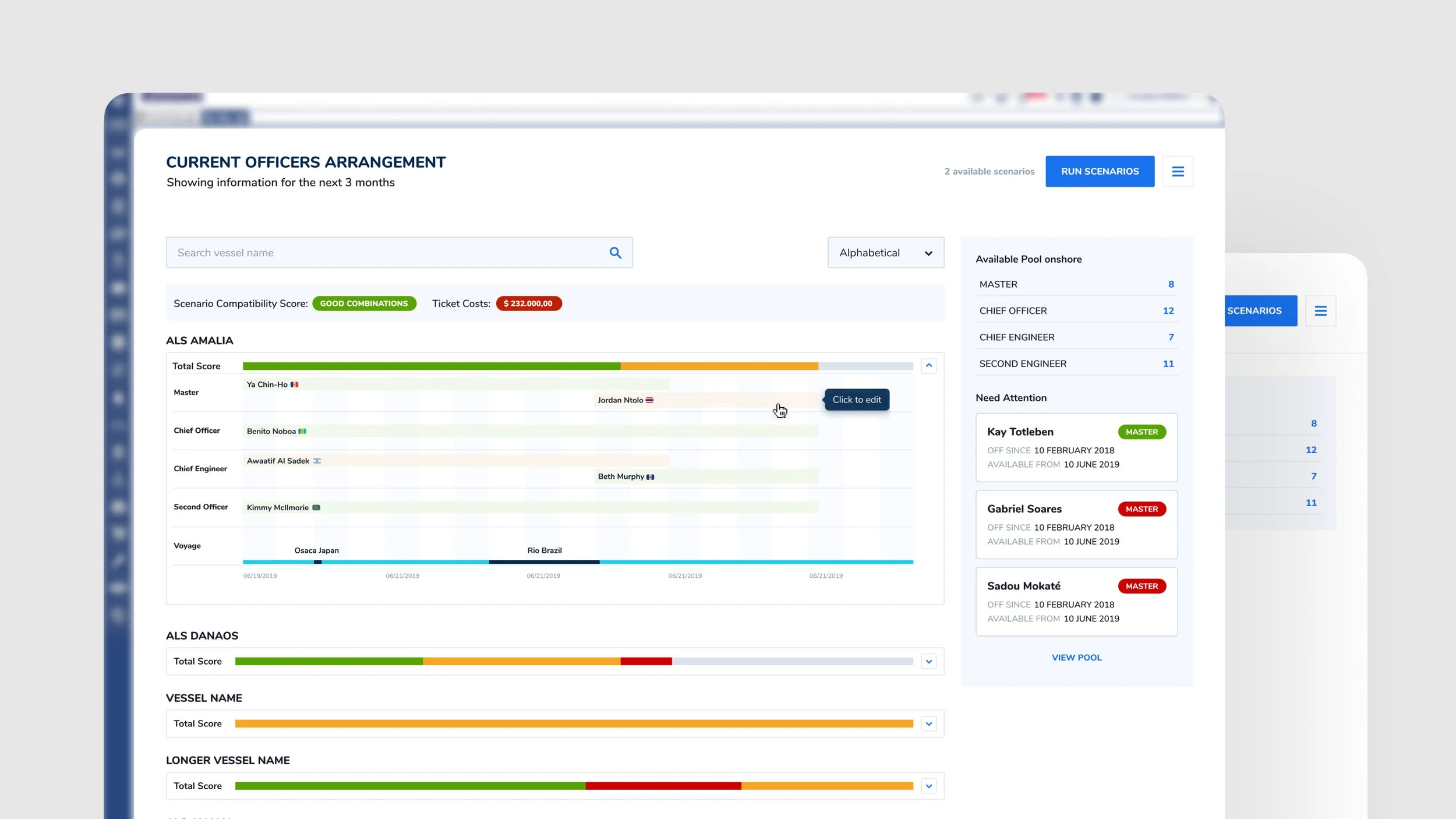 End-to-end design of a crew allocation interface for maritime operations. The tool supports role-based assignments, availability tracking, and scenario evaluation across multiple vessels.